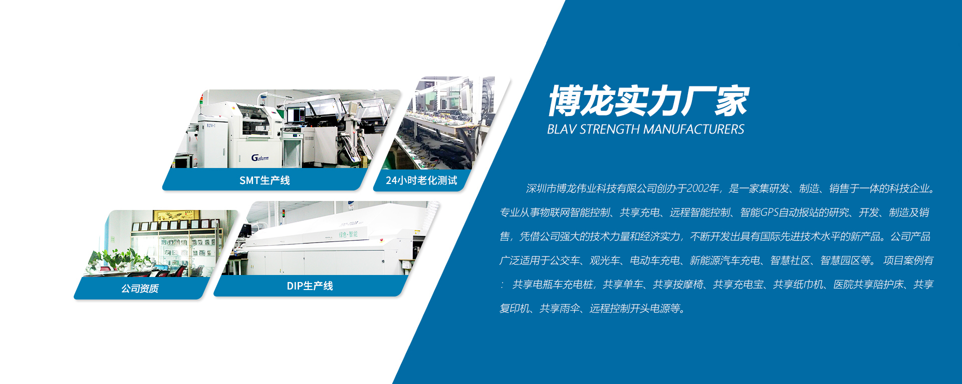 深圳市博龍偉業(yè)科技有限公司創(chuàng)辦于2002年,是一家集研發(fā)、制造、銷售于一體的科技企業(yè)。專業(yè)從事物聯(lián)網(wǎng)智能控制、共享充電、遠(yuǎn)程智能控制、智能GPS自動報站的研究、開發(fā)、制造及銷售,憑借公司強大的技術(shù)力量和經(jīng)濟實力,不斷開發(fā)出具有國際先進技術(shù)水平的新產(chǎn)品。公司產(chǎn)品廣泛適用于公交車、觀光車、電動車充電、新能源汽車充電、智慧社區(qū)、智慧園區(qū)等。 項目案例有: 共享電瓶車充電樁,共享單車、共享按摩椅、共享充電寶、共享紙巾機、醫(yī)院共享陪護床、共享復(fù)印 機、共享雨傘、遠(yuǎn)程控制開頭電源等。